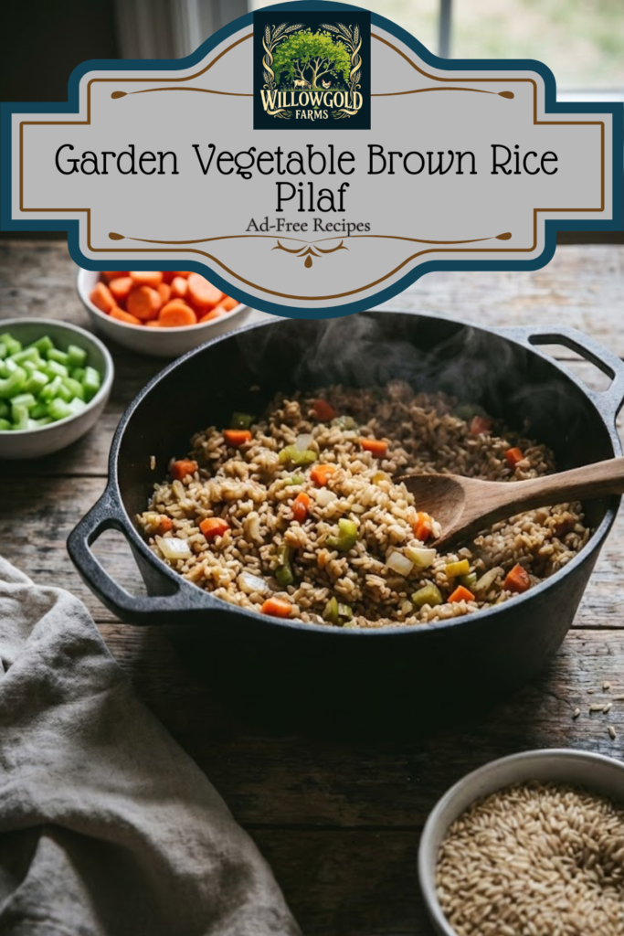 This Garden Vegetable Brown Rice Pilaf recipe transforms simple ingredients into a hearty side dish. By sautéing the "holy trinity" of onions, celery, and garlic in butter before a long, slow simmer in chicken broth, the brown rice absorbs deep flavor. Carrots are added near the end to maintain texture. This Dutch oven recipe yields a large batch, perfect for gatherings or meal prep.