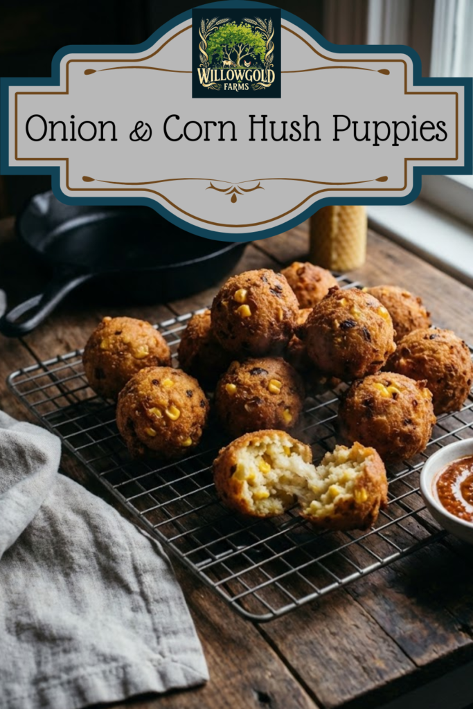 These Savory Onion & Corn Hush Puppies are packed with texture. Unlike plain cornmeal batter, this recipe features whole corn kernels, minced onion, and a dash of hot sauce for a savory bite. An ad-free Southern side dish from Willowgold Farms.